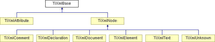 TiXmlAttribute TiXmlNode TiXmlComment TiXmlDeclaration TiXmlDocument TiXmlElement TiXmlText TiXmlUnknown List of all members.